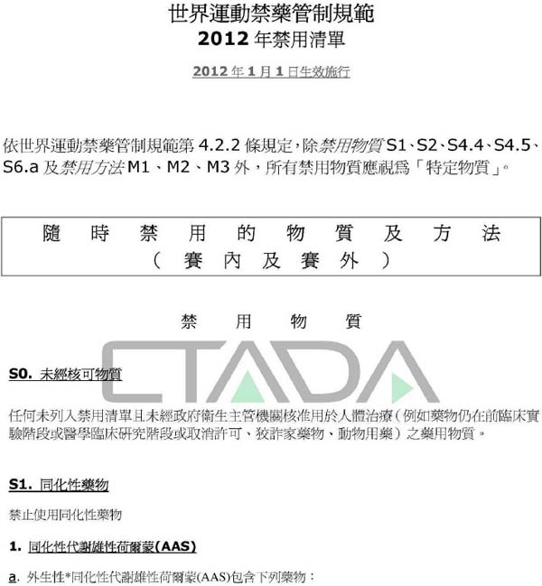 世界运动禁药管制作业系采全球统一标准,我国运动禁药管制也依据国际标准实施。 2012年禁用清单及监控计划」自2012年1月1日起生效,相关资料请已由中华台湾奥委会翻译完成,详细内容如下: