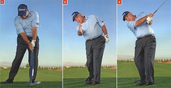 大多业余球员的挥杆,其中最大的问题就是身体重心留在右侧。要想保证铁杆扎实地触球,必须保证杆面向下击球。而要做到这一点,就必须让重心转移到左侧。在下杆过程中,身体朝左侧转移。在触球瞬间找到胸部“盖过球”的感觉对你会有帮助。