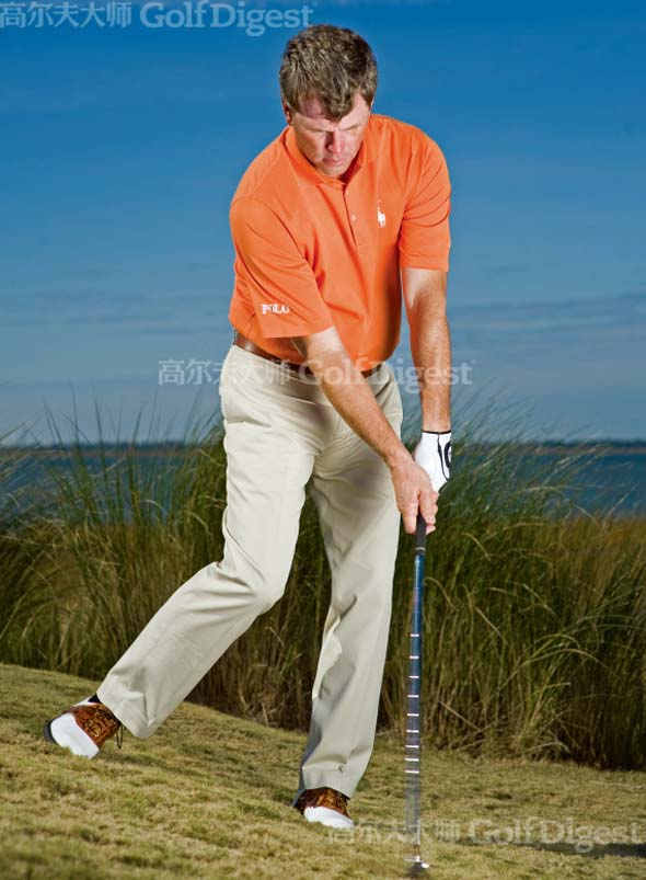 下杆过程中,上半身保持在下半身正上方。为了做到这一点,下杆过程中,先将身体重心转移至左侧, 然后再打开身体。在上半身朝目标方向转动的过程中,感觉左肩向外拉。先转移重心,再转动身体,就会形成内侧的触球线路。