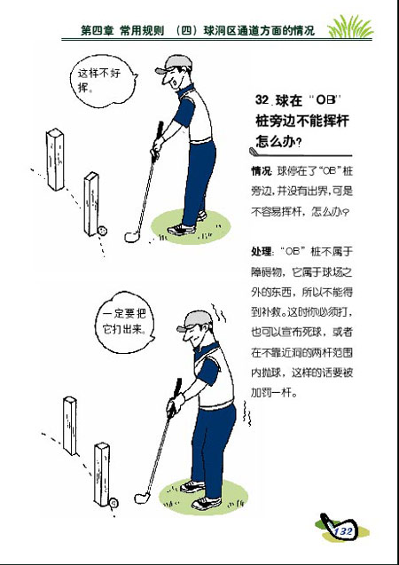 球在OB桩不能挥杆 情况:球停在了“OB”桩旁边,并没有出界,可是不容易挥杆,怎么办? 处理:“OB”桩不属于障碍物,它属于球场之外的东西,所以不能得到被救。这时你必须打,也可以宣布死球,或者砂靠近洞的两杆范围内抛球,这样的话要被加罚一杆。