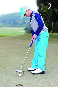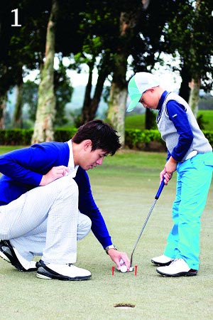 许多青少年选手(大多数业余球友也一样)在面对三、四呎的短推杆时,经常在触球之后立刻将杆头拉起,或者屈起手腕,导致杆面右开或佐拉,而错失那些看似必进的短推杆。久而久之,甚至丧失信心,每每面对短推杆时,就不由自主地软手。 正确的瞄准加上以方正的杆面触球,是短推杆能否进洞的关键。这里有个简单的练习方法,能让小朋友学会减少手腕动作,让杆面方正通过触球。首先,在练习果岭找一处平坦区域,在离洞口旁三呎处插上两根球梯,间隔比推杆杆头宽2到4公分,形成一道闸门。 在闸门后方约两颗球处摆上小白球,将杆头置于球后方,摆出瞄球准备(图1)。 接着,要求小朋友不要上杆,直接让杆面贴着球往前送,并且让杆头在送杆时仍维持在闸门内(图2)。这样的练习能让他体会将杆面方正且贴地送杆的感觉,同时看着小白球平顺笔直地滚进洞口。 如果小朋友的手腕动作很多,可以同时要他采取左手在下的握杆方式(图3)。当他熟悉这样的推杆方式后。在洞口旁三呎处将多颗小白球围成一个圆(图4),要他一口气将所有球推进洞口,如果其中一球不进,就得重来。这能培养他在球场上面对短推杆时的抗压性。此文章来源于网络, 版权归原作者所有。