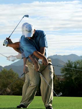 除非你像亚当-斯科特那样瘦而柔韧性好,否则上杆到顶点的时候,就不能到将左臂伸直,双脚着地。如果你盲目模仿这个动作,那么你将会冒险将左肩下沉,或者更糟糕的是,引起重心逆转。相反,可以跟我学习下面的挥杆方法:将左脚抬起,左臂稍稍弯曲,这样当我击球时就能够比亚当-斯科特转动更多。我的站位比他的狭窄,这使我转离高尔夫球。