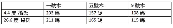 大多数球手的挥杆速度大概在90mph,下面是在4.4度和26.6度时,两种不同温度条件下的一组球速对较。