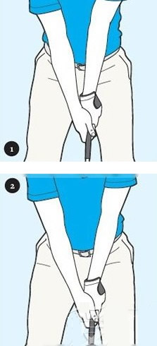 如何避免肘关伤:大多数业余球员都会对“保持左臂伸直”(上图1)的说法感到困惑。注意一点:如果你的左臂自然悬垂于身体侧面,尽管手臂伸直,但仍处于放松状态。这才是合理的伸直状态。从启动上杆到收杆,始终保持手臂的放松(上图2)。下杆过程中球杆的动力会将左臂自然拉直,根本不需要刻意去做。—— 约翰逊