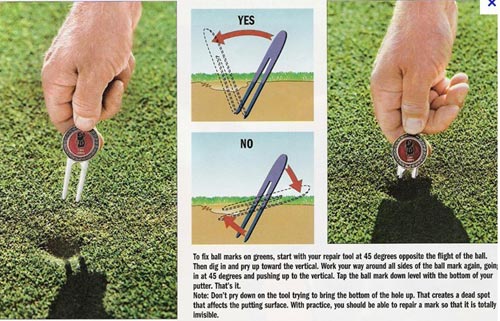 许多球手认为修复弹痕应该将工具以一定角度插入草皮,那样的话叉子就正好在弹坑中心的下方,然后把修复工具当成一个杠杆,把弹痕底部抬高与草皮表面持平。把弹痕下面的土壤抬高会伤害到果岭草根部,甚至损伤果岭草。