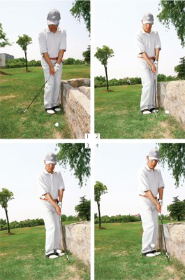 由于小球和墙距离比较近无法正常上杆,可以让小球从墙体反弹脱困。击球要领有以下几点:第一,要知道果岭或者球道的距离,以确定反弹角度;第二,集中精神做击球准备,选杆的时候不要选择杆面角度较大的球杆,考虑到球要有一定的反弹力,所以选择8号、7号、6号、5号等杆面倾角较小的球杆比较合理,因为杆面倾角大的球杆反弹力度不会很大;第三,击球时上杆很小,类似于锤头敲击,球撞到墙上后反弹回来,不用收杆。