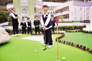 据了解,该幼儿园投入200多万元建设高球场,引进美国、韩国多家知名厂商联手开发的世界领先的室内18洞模拟高尔夫系统,从国外进口三色果岭草坪。通过电子模拟系统,学生身在校园,可参与全球上百家知名高尔夫球场实景演练。
