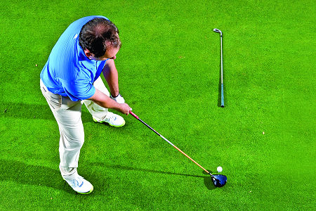 为了要让球以由右往左的弹道朝目标飞去,你要做出能让球一开始往目标方向右边飞去的挥杆路径。肩膀是挥杆路径的主要关键,所以,一开始双肩就要瞄准球的起飞线,也就是目标右边。