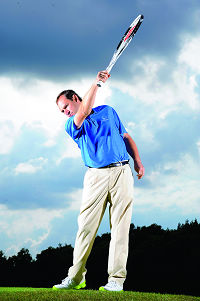 大多数渴望进入8 字头的球友,应该能打出由右到左的球路,问题在于如何掌控侧旋强弱的感觉。为了做到这一点,且先放下高尔夫球杆,改拿起网球拍。为什么?首先,网球拍的拍面较大,空气阻力比起高尔夫球杆的小杆头大多了,这让你能够轻易感受拍面的角度与位置。此外,最主要的理由是左弧球的挥杆动作其实和网球的正旋抽球动作很类似。球拍的动作路径相仿,且前臂通过触球时的旋转动作也一样。