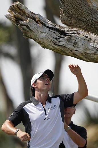 在过去的比赛中,麦克罗伊的球砸中过观众,但,这次却击中树枝,夹在枯树皮中。