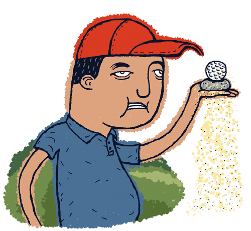 球员对此束手无策,只好请来裁判帮忙。恰巧笔者就在附近,于是让泰国球员先不要动球,然后在球后方做一个标记(插了一根Tee在球后方),再让球员小心地将球下方的石块取除,这时有趣的一幕发生了:由于球之前是依靠石块的支撑才停在沙坑斜面上的,故取除支撑后球自然就会发生滚动,当把球拿起重新放回原处时,球居然不能够静止在原来的位置。