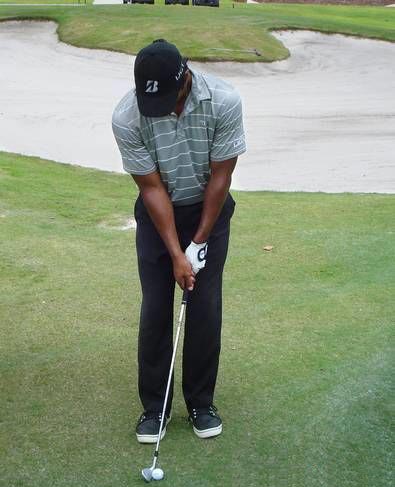 如果球位不错但又离球洞太远,用推杆不太容易时,此时可选用角度较大的球杆如8或9号铁。准备动作时,将球放在与后脚大脚趾成一线位置上,两脚站得较窄,杆面从杆头开始稍为竖起,手必须要在球前,65%重心落在前脚,挥杆感觉与推杆一样。重要一点必须先打到球再打到地。