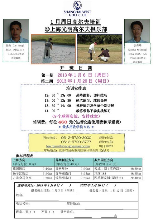 上海光明高尔夫俱乐部2013年1月周日培训安排