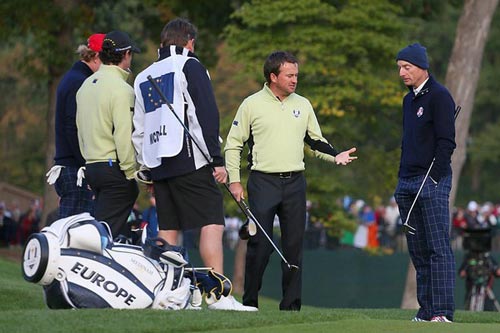 莱德杯第一场四人二球赛,美国队的吉姆-福瑞克(Jim Furyk)/布兰特-斯内德克尔(Brandt Snedeker)对战欧洲队罗里-麦克罗伊(Rory McIlroy)/格莱姆-麦克道尔(Graeme McDowell)。第2洞,小麦的发球落在果岭旁边的球场喷水器附近。麦克道尔提出免罚抛球,但福瑞克明确反对,最终裁判长时间讨论后要求欧洲队原地击球。莱德杯的**之火,也随着这一规则争议迅速点燃。