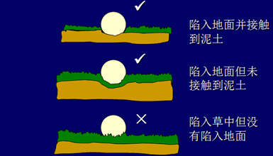 一、能否得到补救。规则25-2讲到:在球洞区通道上的短草区域,因下落时自身的冲击力而陷入球痕中的球可以得到补救。“短草区域”是指草的长度修剪得与球道上的草相同或更短,包括穿越长草区的通路在内的球场上的任何区域。当然,如果当地规则规定了陷入地面的球的补救区域延伸至果岭通道的时候,此时球陷入长草里的地面也可以接受补救。下面有一幅图,相信各位对陷入地面的球的判断应该有更好的理解。如果不能用肉眼判断,可以将球标定后并向记分员或对手宣布其意图后将球拿起判断。