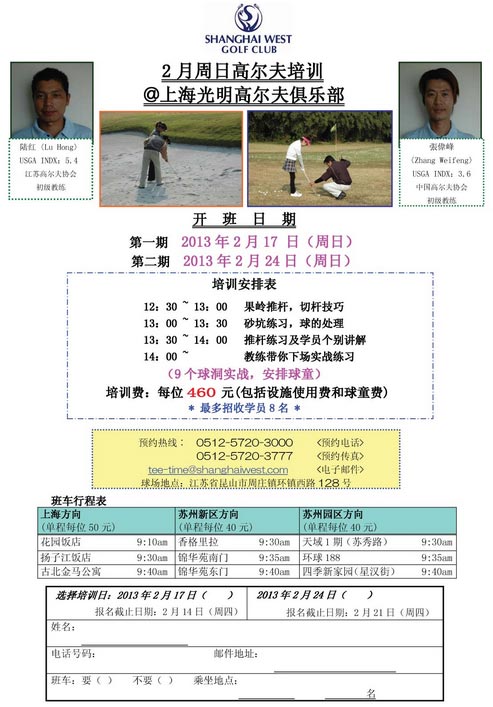 上海光明高尔夫俱乐部2013年2月周日培训安排