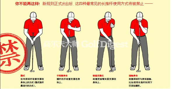 研究新规则会发现,它不但允许使用长推杆和腹式推杆,而且允许以符合新规则的特殊推杆方式来推杆。比如说,可以让握把支撑在前臂上,另一只手压在握把上(类似于伯纳德·兰格1993年大师赛上夺冠时的姿势);或是让握把长于传统推杆,可以依靠在前臂上(类似于2012年马特·库查尔的推杆方式)。为了详细说明哪些是允许的而哪些是被禁止的,美高协在网站上公布了推杆姿势示例。