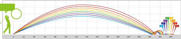 目前在这部分科技处于领导地位的是Trackman,我们使用这套系统来测量出不同温度下开球木杆飞行距离与总距离的差别。从摄氏零度到35度,以每5度为单位。在无风且相同出球状况的条件下,我们计算出了实际的数字。受测的球员分为三种:一是挥杆速度高达112. 3m p h的巡回赛职业选手,二是速度98.2mph的单差点好手,三是速度91.1mph的中差点球友。
