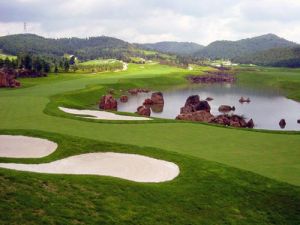 好好分析一下,万一错失旗杆,此时最好的落球点在哪里。现在,大多数球场都会把障碍设在果岭前方,因此,你应该将目标落点设定为旗杆为后方5码左右的区域,从而为自己的小失误预留一点容错空间。选择可以让小球飞跃的险障的球杆。仔细分析哪支球杆可以助你吧球送到果岭的后部、让后就那这支杆击球。