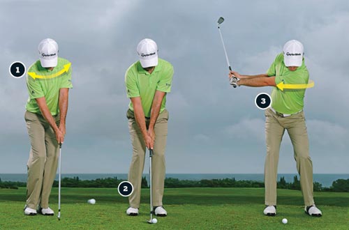 比起用全挥杆,我们更推荐用四分之三的半挥杆控制球距和方向。但是四分之三的半挥杆并不代表你挥杆时就可以偷懒了。同时,肩膀的扭转也很重要,注意上杆时要充分转肩, 挥杆流畅通过击球区域—-不要在击球点停下动作。 就像是你第一次去练习场时做的热身动作那样。握杆稍微靠下一点(握短),自然地上杆、然后用轻微的转体来带动挥杆击球。