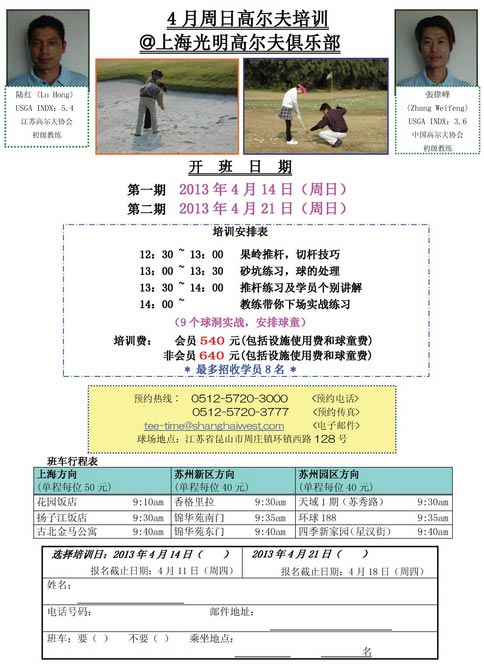 上海光明高尔夫俱乐部2013年4月周日培训安排