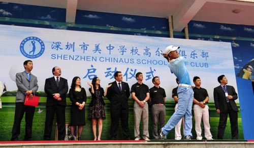 深圳市高尔夫球协会常务副主席兼秘书长管林根、深圳市高尔夫球协会副秘书长回宏亮、深圳市龙华新区公共事业局教育科科长张学斌、深圳市体工大队训练科副科长及高尔夫球队领队尹汉钊、观澜湖执行董事伊恩-罗伯茨(IainRoberts)、观澜湖高尔夫学院总监马克-亨德森(Mark Henderson)、深圳宁远教育集团及美中学校董事长黄丽宁、深圳美中学校校长俞宗友、副校长胡光宇莅临现场,与中国著名青少年高尔夫球手回昱衡等数百名学生们一起见证了深圳美中学校高尔夫俱乐部的启动仪式。
