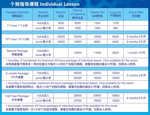 厦门高登威·利百特高尔夫学院个别指导课程收费表