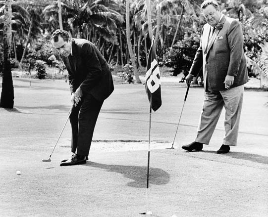 即使算不上优雅,尼克松(Richard M.Nixon)也是一个果断而顽强的高尔夫球手──他能打出80多杆或90来杆。 左图为1968年10月15日,尼克松在佛罗里达州科比斯坎与喜剧演员格里森(Jackie Gleason)打高尔夫。