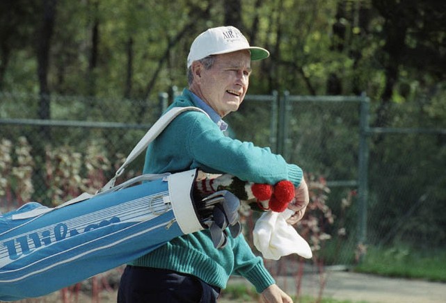 在担任总统期间,老布什的成绩一般在80多杆、90来杆,差点约为20。左图为1991年10月20日,老布什背着高尔夫球杆在弗吉尼亚州盖恩斯维尔的Robert Trent Jones高尔夫俱乐部。