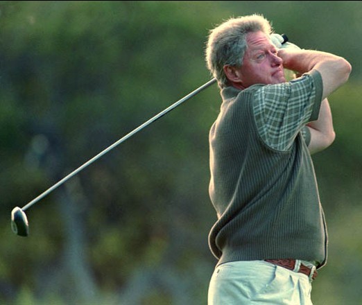 克林顿(Bill Clinton)经常加击,以致于一些职业高尔夫球手把加击叫做“克林顿”。 克林顿的成绩一般在80多杆、90来杆,差点约为20。 这位美国前总统还以在球场上富有感染力的态度而著称,即使在表现不佳时他也很享受比赛。 图为1995年9月4日,克林顿在加州帕博海滩的高尔夫球场打球。