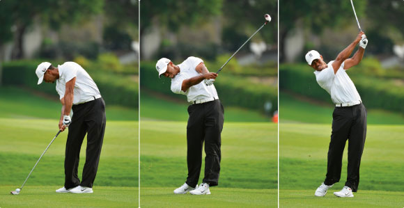 许多业余选手试图去扫击球道木,但是很容易导致打厚。从图片能看出来老虎向左移动得很充分。他的5号木在击球的时候仍然在向下走,甚至还会掀起一块草皮。