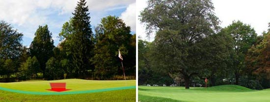 最著名的“欺骗性斜坡”是在名人赛的故乡——奥古斯塔国家高尔夫球俱乐部。那里的第14洞暗藏玄机。同时,高尔夫圣地圆石滩的第14洞也是经典代表之一。