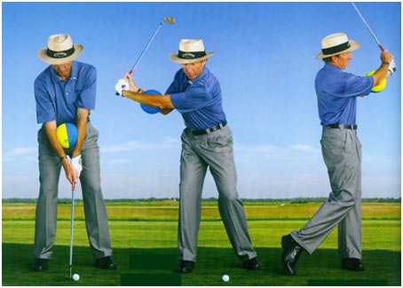 为了找到双手、手臂和身体协调一致完成挥杆的感觉,在双手、前臂之间肘关节以下放一个海绵球,或者是在两臂之间夹住一条毛巾。不管是哪种方法,都需要在练习半挥杆时保持物体不动。