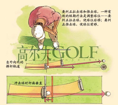 一种有效的短期疗法是,改变球与站位的相对位置。要纠正拉击球,使球位后移一英寸。在拉击球挥杆不变的前提下,这样你更有可能使杆面在垂直的情况下触球。要纠正推击球,则使球位前移一英寸,这样更有可能使杆头在垂直于目标方向线的情况下触球。