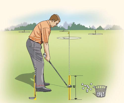 你可以在每轮比赛之前去开球练习场练习一下瞄准。用两支球座固定一根4英尺长的带子,使带子处于目标方向线上。身体与带子平行,然后在地面上沿脚跟放置一支球杆。这支球杆应该与目标方向线平行,球杆前方的延长线不能逐渐靠近或远离目标方向线。换几个目标,重复该训练法。关键在于将球杆沿脚跟放置,而不是像大多数球手那样将球杆沿脚尖放置。由于你的双脚很有可能张开,观察脚尖连线容易产生误导。脚跟连线才是判断瞄准方向的最佳指南。
