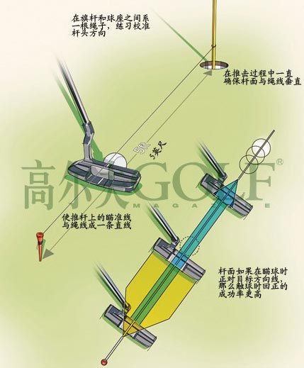 利用辅助练习设备检查校准状态。找一条绳子,一端系在旗杆底部,一端系在插入地面的球座上,5英尺的距离为宜。使绳线处于球心和推杆校准线的上方,并保持方向一致。以此线为参照物,练习推直线球,如果推杆偏移出绳线能马上看到。每天只需练习几分钟,你的校准能力将大大提高。