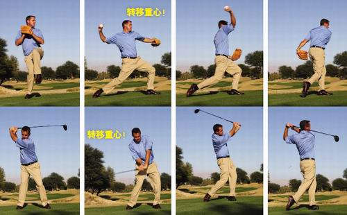 在上面的最后两张图中,你可以看到投手最后做的事情是转动身体,让出扔球空间,然后以最大力量将球投向本垒。这一动作与高尔夫挥杆也是相似的。当你将重心向目标转移后,接下来你需要转动身体,让出下杆空间,然后向目标方向抽打高尔夫球。