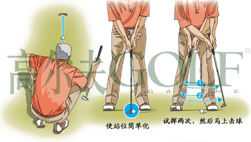 从各个不同角度研读果岭,试图分析地形对偏移路线的哪怕再小的一点影响,那样只会把自己搞疯。你只需要从一个角度研读果岭(通常以球后方为佳),然后站位,最多试挥两次,击球。