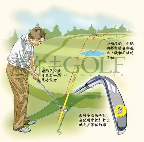 进攻多层果岭时,低飞多滚动的球几乎总是最佳打法。要打出低飞多滚动的球,你必须先接受用小杆面倾角球杆(比如6号铁杆)切击的做法。