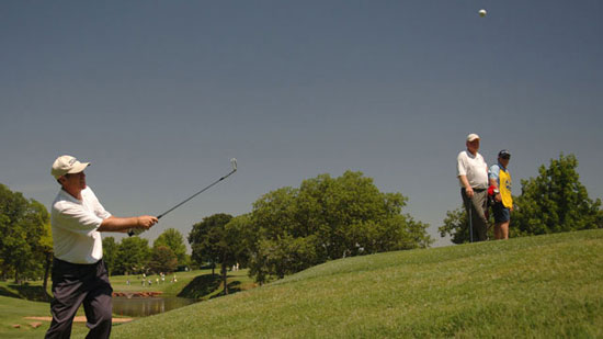 下杆时多依靠身体,充分释放杆头,这样可以使球飞行高度高,减少了滚动,应该有杆头流畅穿过球的感觉。