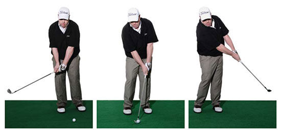 挥杆动作和正常挥杆也一样,预备姿势重心偏左,在挥杆过程中,重心保持在左脚不要向右转移重心,下杆过程中,握把必须前倾,握把拉着杆头下杆,触球时,大部分重心要保持在左脚,杆身向目标方向倾斜。收杆后挺住姿势,触球过程中,左手腕保持平直。