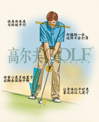 瞄球:根据不同的倾斜程度,双脚应该比平时更靠近球位3英寸左右,这样是为了加大下杆时的陡直程度。记住,这么做会减小大约2支杆的杆面倾角。但不要让这影响你的选杆,为了补偿杆面倾角的不足,你需要把杆握短一些(为了控制)并做四分之三的轻松挥杆,这样触球时杆面回正的机会更大。