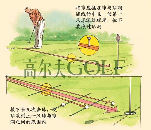 对于大多数业余球手而言,以标准杆上果岭是主要的挑战,他们在攻果岭时很难顾及推击。变成一位长推高手,会让你在球友们当中拥有明显的优势,——更何况现在的果岭正在变得越来越大。要学习如何充满自信地完成长推,第一步是发展可靠的距离感,然后才有可能去考虑推击路线。要发展长推手感,可以按照下面的步骤去做: