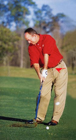 如果你的铁杆一直打厚,可以试试以下的方法。拿5号铁杆做好设定动作,另外放一颗球在靠目标方向离前脚跟一尺的地方。随着你的下杆,触球时让你的皮带扣环对准第二课球(见上图)。你的重量就会往前移且转开双臀,将下杆圆弧的最低点移到球之前。