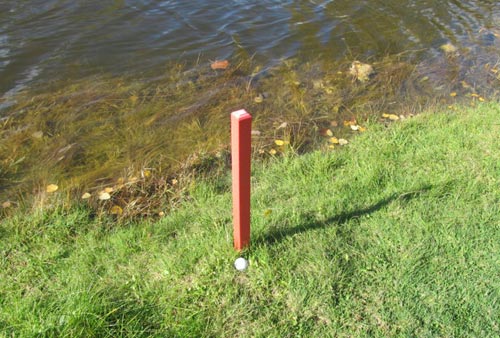 顺便说一下,黄桩(标识正面水障碍)或红桩(标识侧面水障碍)都是可移动妨碍物, 击球前可被移走;但是白桩(标识界外)就不可被移走,因为用来标识界外(Out of Bounds)的物体(比如白桩, 墙,篱笆,围栏等)虽然是人造的, 但不属于“妨碍物” (Obstructions) ,所以把球打到这些物体边, 是不允许移动这些物体的。