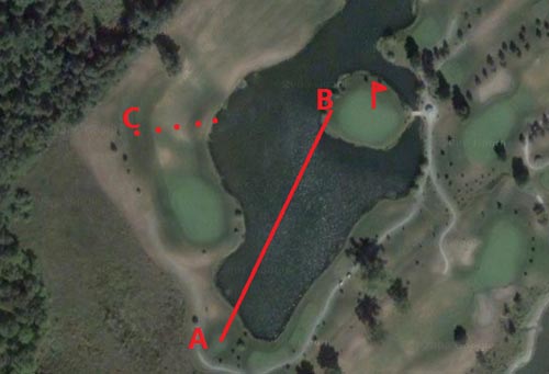 (1)回到尽可能靠近打初始球处打下一杆。也就是说球员可以回到图中A点打下一杆。这个选择可行。