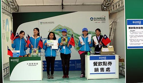 观众们进场后,可以先在「大会服务处」索取「大会手册」、「编组出发表」、购买「餐饮点券」,喜欢摇旗吶喊的,这里有热心厂商提供的中华民国青天白日满地红的「国旗」。领完游园三宝,开始今天的高球行程。