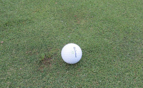 4.在果岭上划线来标定球位。这是不被鼓励的做法,因为可能损伤果岭,并且有可能会违规(测试果岭或指示推击线)。