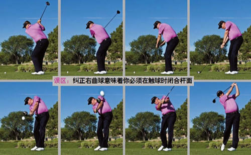我敢肯定,你击球右曲的真正问题,是杆头移动路径过于由目标线之外向目标线之内。在触球时正对或闭合杆面,只能调整出球方向,但如果你不能修正大幅度的由外向内的挥杆路径,仅调整杆面将收效甚微。另外,在触球时尝试将杆面摆正也很少能够奏效,反而会经常打出左直球。