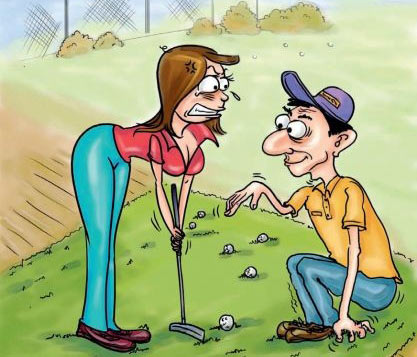 教练在指导学员的过程中,难免会有身体上的碰触,大部分男教练在指导女学员的时候,都会很有礼貌地注意碰触的位置和靠近的距离,最大程度上避免让女学员产生反感和抵触的情绪,然而,还是有些人动起了歪脑筋。小Y是个喜欢运动的女孩,因为平时的锻炼练就了一副匀称健美的身材,她的先天条件也不错,长相姣好,上围丰满,走在街上回头率颇高。最近,她忽然迷上了高尔夫,便到练习场随便找了个小教练帮她指导指导。这小教练虽然年轻,却是个“老油条”,摆出一副严肃的表情,实则一双眼睛不安分地在小Y身上扫来扫去。小Y一心想把球学好,也就没想太多,教练让她怎么摆动作就怎么摆。从站姿开始学起,小Y握着球杆站好,小教练站在她正对面,眼睛斜斜地盯着小Y 的衣领口。小Y按照小教练所说眼睛紧盯着杆头,也就没注意小教练的眼神正不怀好意地吃她的“豆腐”。小教练还装出义正言辞的口气对小Y说:“低点儿,再低点儿。”小Y的站姿几乎要弯成了90度直角,小教练才算罢休,连在场的工作人员都不好意思再看下去,可小Y还蒙在鼓里。直到后来小Y对高尔夫有了更多的了解,她才意识到当初找的那位“启蒙教练”竟是如此心机叵测。